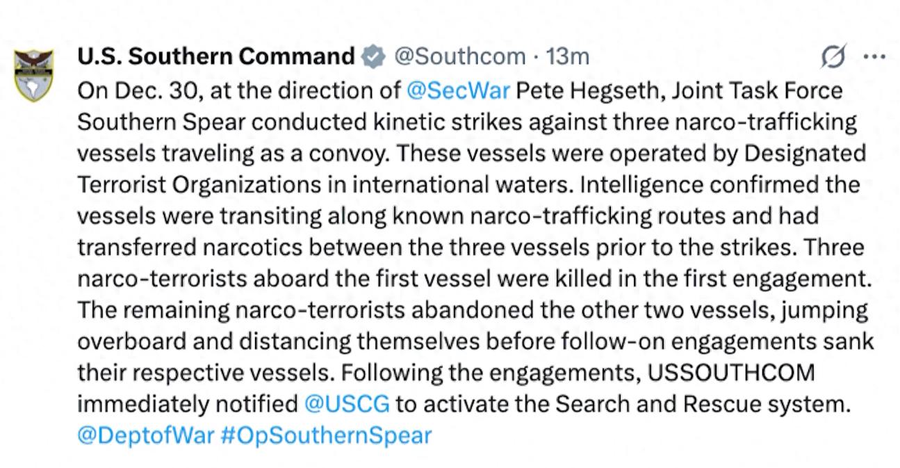 2025年12月31日 美国南方司令部发布声明称此前一天打击三艘“贩毒船”