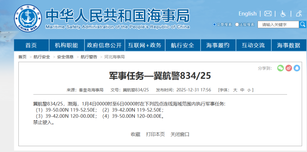 冀航警834/25,渤海,1月4日0000时至6日0000时在下列四点连线海域范围内执行军事任务:
