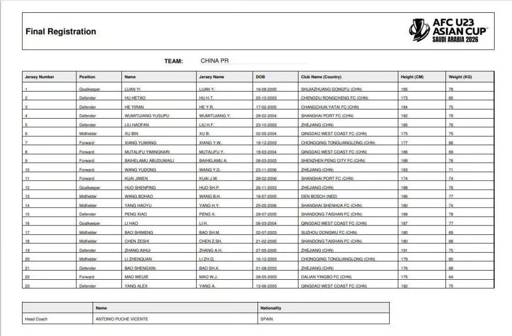 图为亚足联发布的2026年U23亚洲杯中国队球员注册名单