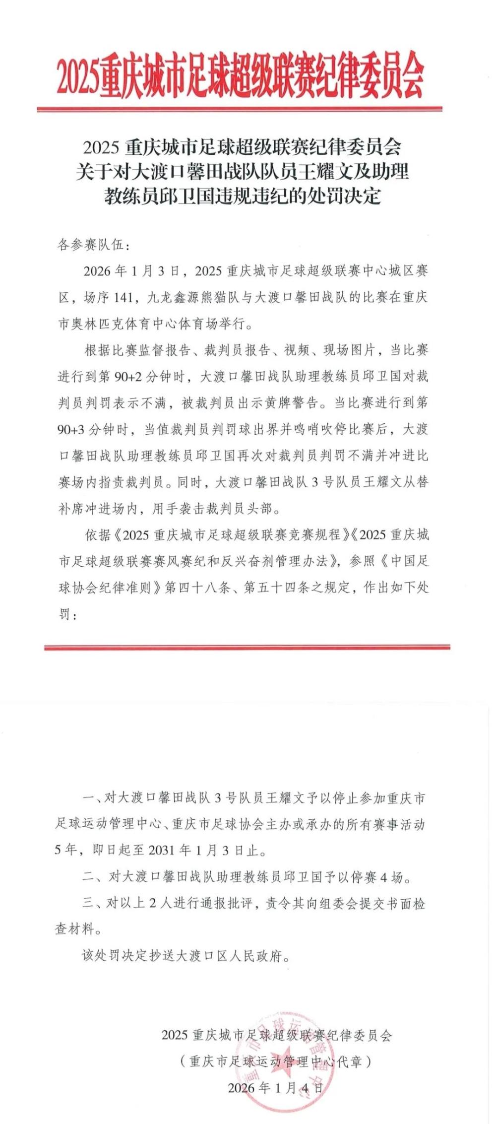 决定称,依据《2025重庆城市足球超级联赛竞赛规程》《2025重庆城市足球超级联赛赛风赛纪和反兴奋剂管理办法》,参照《中国足球协会纪律准则》第四十八条、第五十四条之规定,作出如下处罚:对王耀文予以停止参加重庆市足球运动管理中心、重庆市足球协会主办或承办的所有赛事活动5年,即日起至2031年1月3日止;对邱卫国予以停赛4场;对以上2人进行通报批评,责令其向组委会提交书面检查材料。