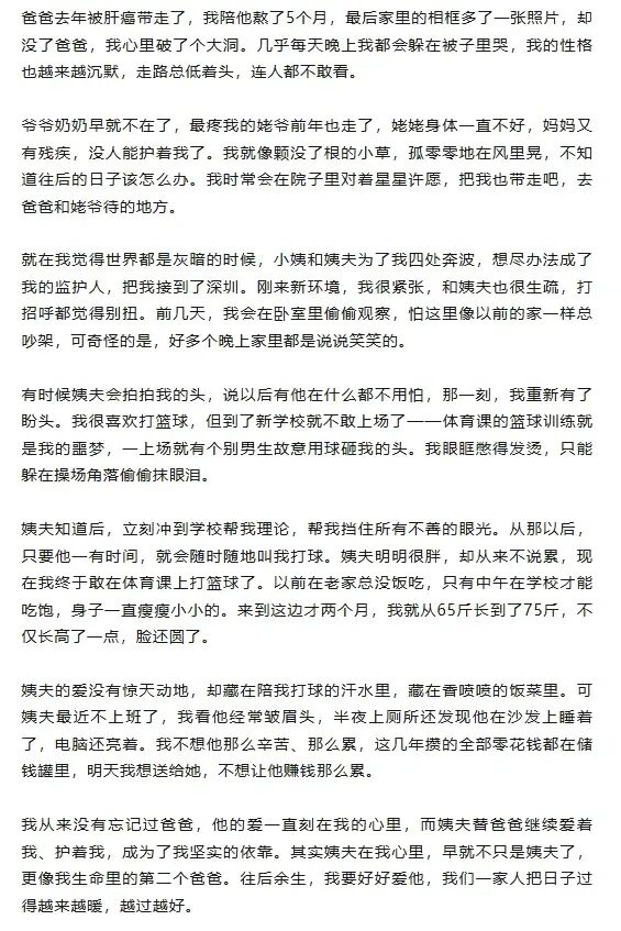 近日,12岁女孩佳佳的一篇作文《我的第二个爸爸》,让深圳姨夫危一的故事温暖全网。