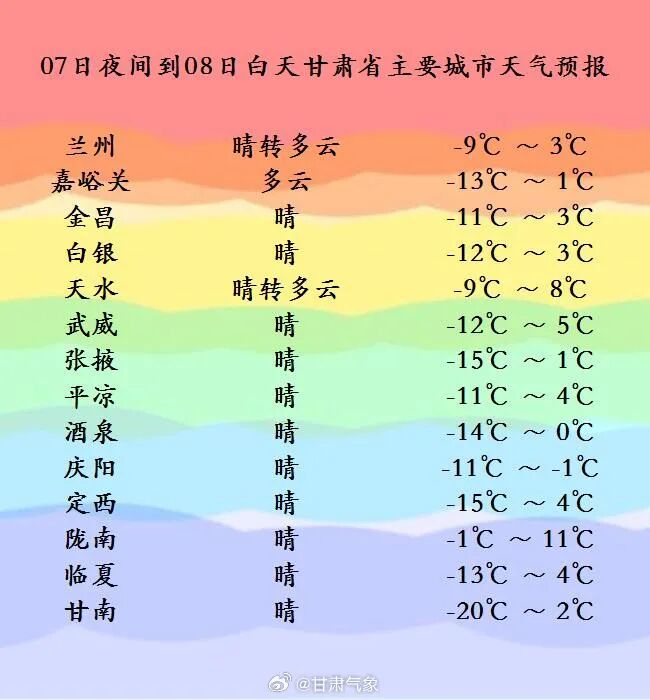 今天夜间到明天白天(1月7日20时-1月8日20时),酒泉、甘南、陇南三市州多云,局部地方阴有小雪或雨夹雪;省内其余地方晴或多云。另外,河西五市有5级左右西北风,局部地方有沙尘。