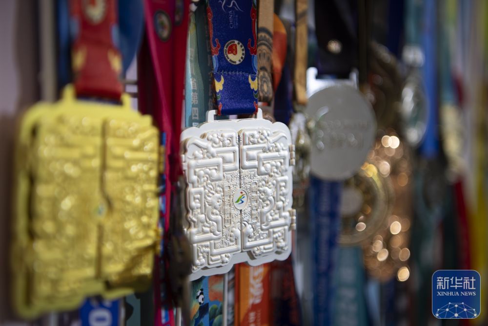 ↑ 一家奖牌生产企业在博览会上展示各种马拉松赛事奖牌。