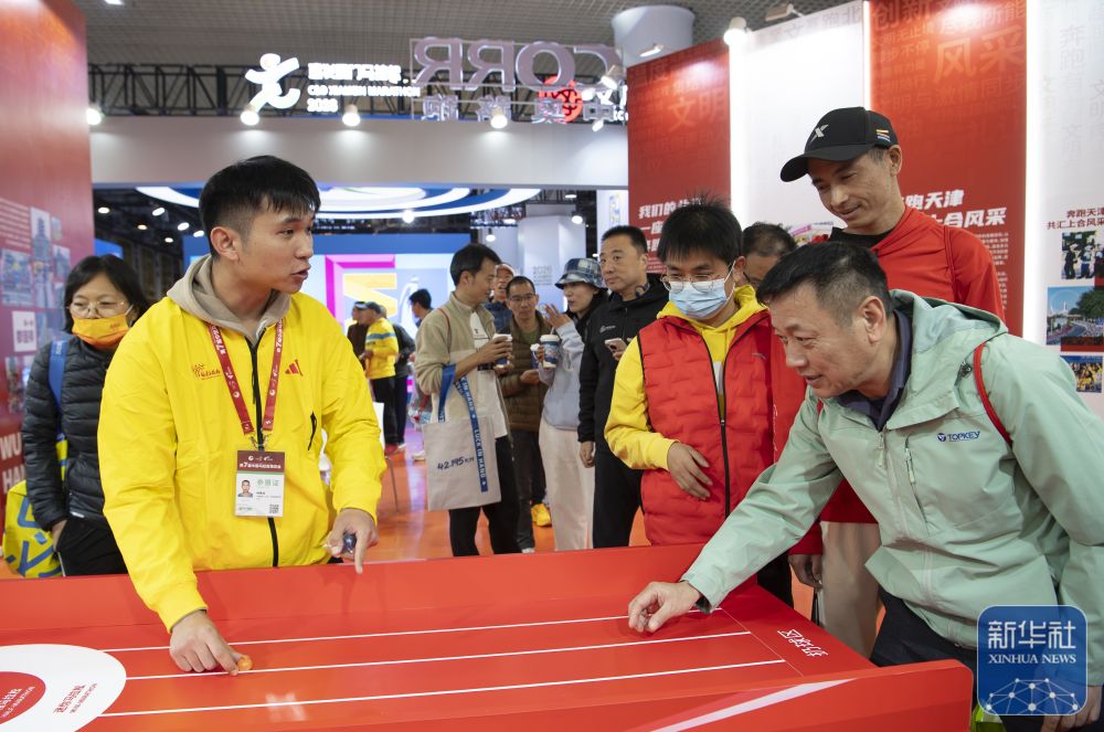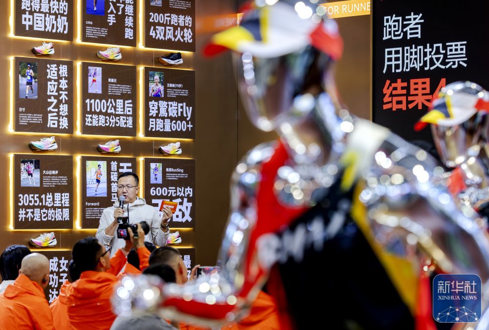 ↑ 一家体育用品厂商在博览会上推介自己的马拉松赛事体育用品。