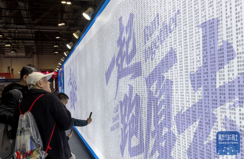 ↑ 参加厦门马拉松赛的选手在博览会厦门马拉松跑者姓名墙上寻找自己的名字。