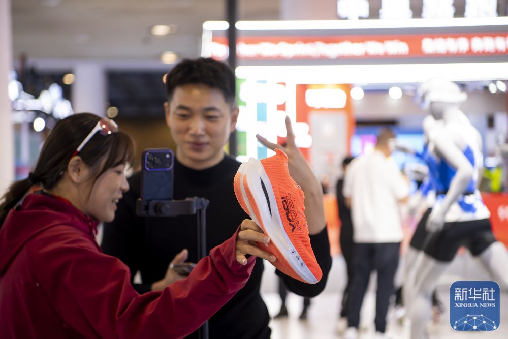↑ 两名体育用品企业工作人员在博览会现场利用电商平台直播推销运动鞋。新华社记者 魏培全 摄