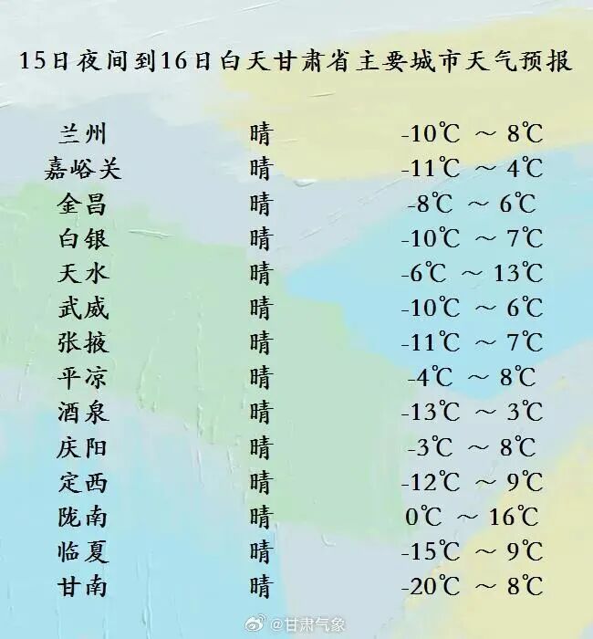 明天夜间到后天白天(1月16日20时-1月17日20时),全省各地晴或多云,酒泉市局部地方阴有阵雪。