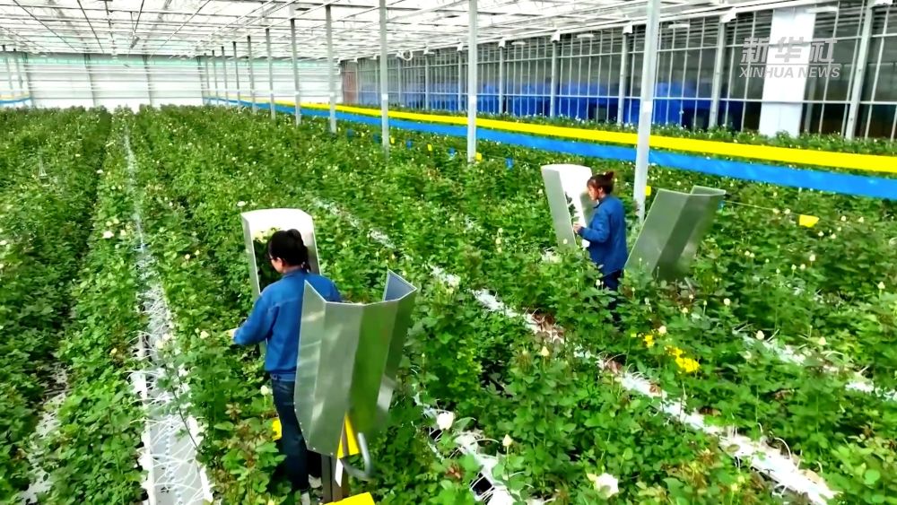 冬日,在甘肃省临夏回族自治州临夏市的百益亿农国际鲜花港的智能温室内,玫瑰绽放,花香四溢。