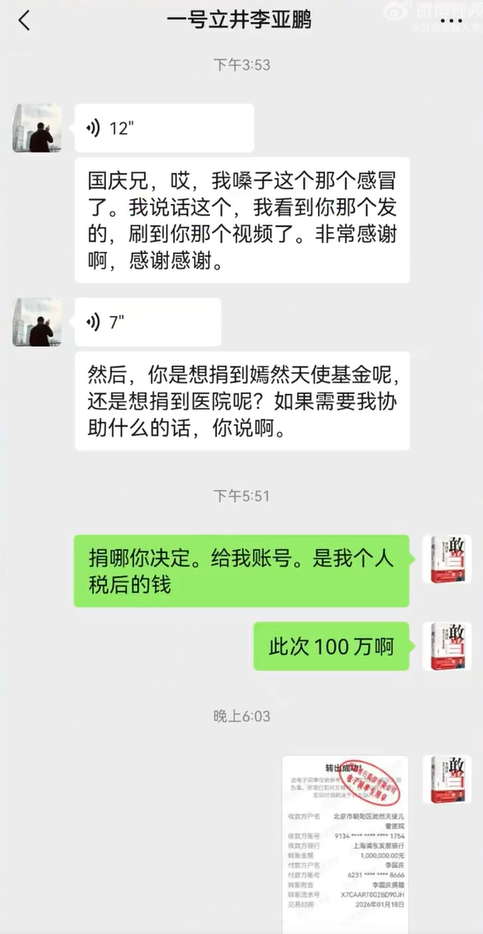 近日,北京嫣然天使儿童医院被曝因欠租面临关停,引发广泛关注。1月18日,当当创始人李国庆发视频称,他已向李亚鹏捐款100万元,并晒出银行转账截图。