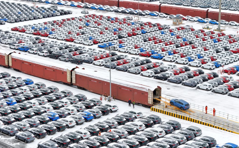 ↑ 1月18日,在山东港口烟台港,国产汽车从商品车班列中倒车驶出到码头集结,等待装船出口(无人机照片)。新华社发(唐克摄)
