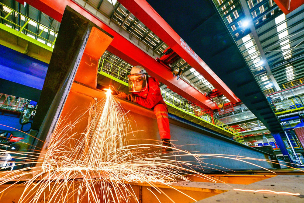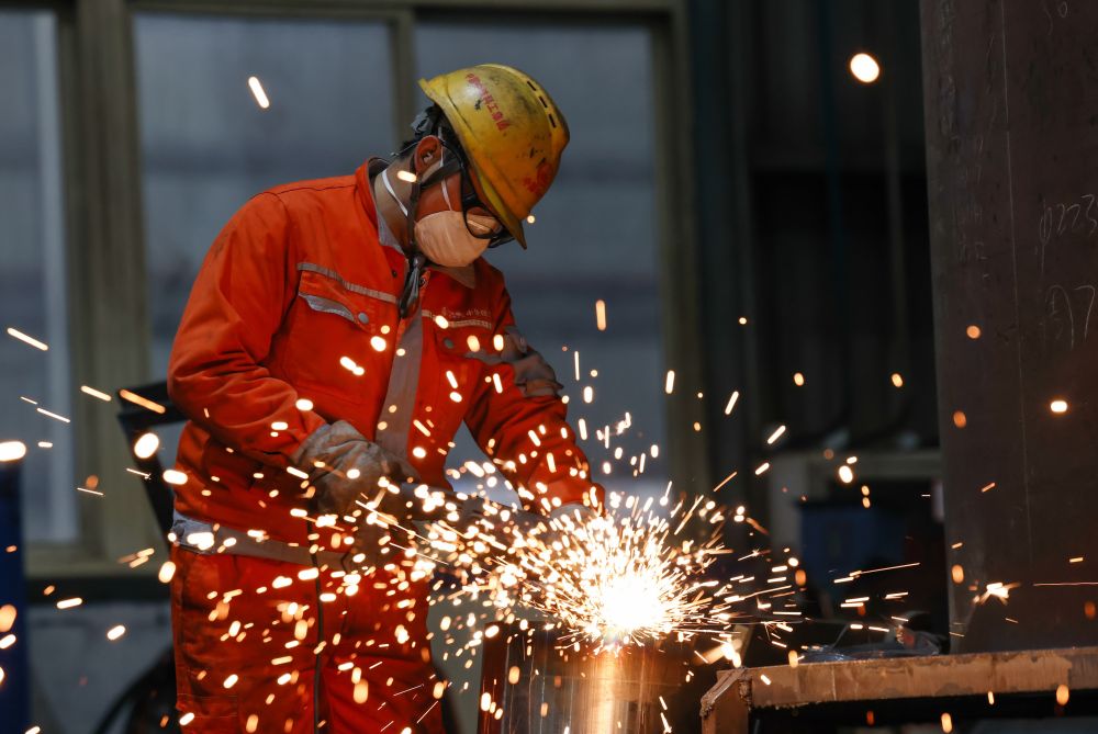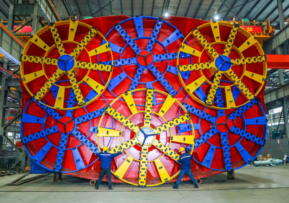↑ 1月19日,在位于江苏省江都高新技术产业开发区的江苏广泓重工设备有限公司,工人在顶管机总装车间作业。新华社发(任飞摄)