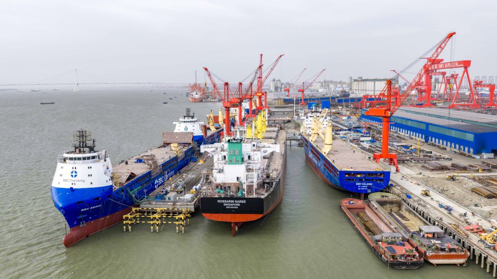 ↑ 1月11日,在位于江苏省泰州市高港区的泰州三福船舶工程有限公司生产基地,多艘大型船舶在建造中(无人机照片)。新华社发(周社根摄)