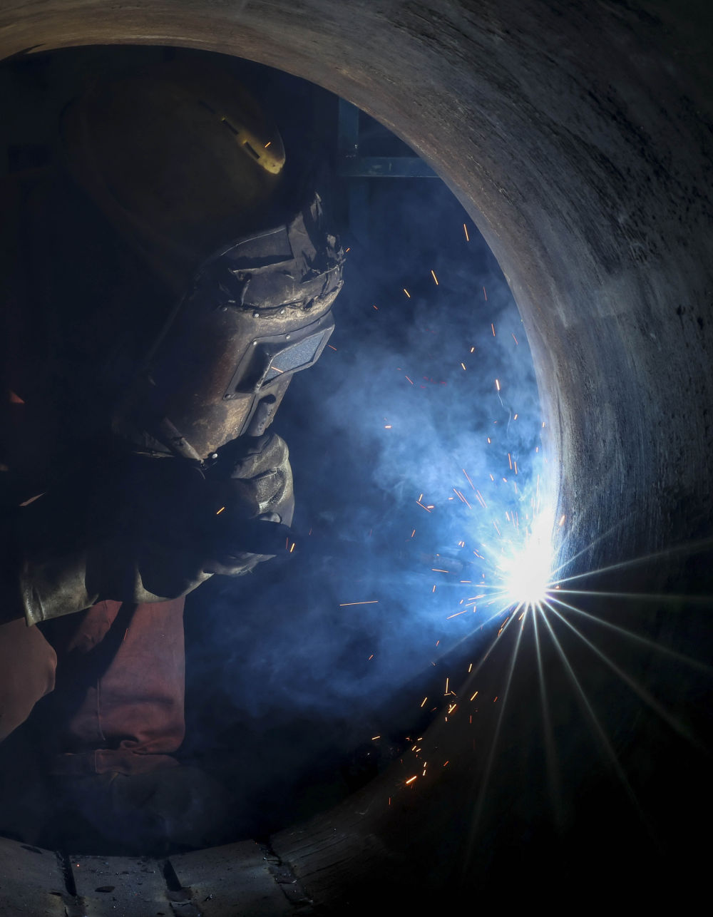 ↑ 1月19日,在天津市滨海新区,海上油气平台建设工人进行气割作业。新华社发(杜鹏辉摄)