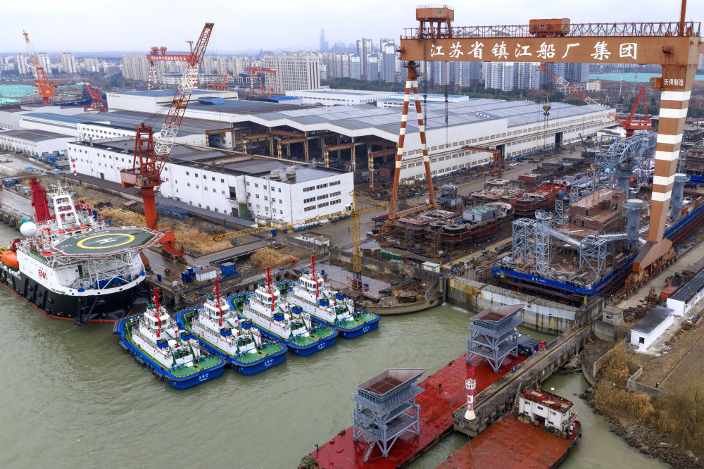 ↑ 1月19日,在江苏省镇江船厂(集团)有限公司,工人在生产厂区造船(无人机照片)。新华社发(辛一摄)