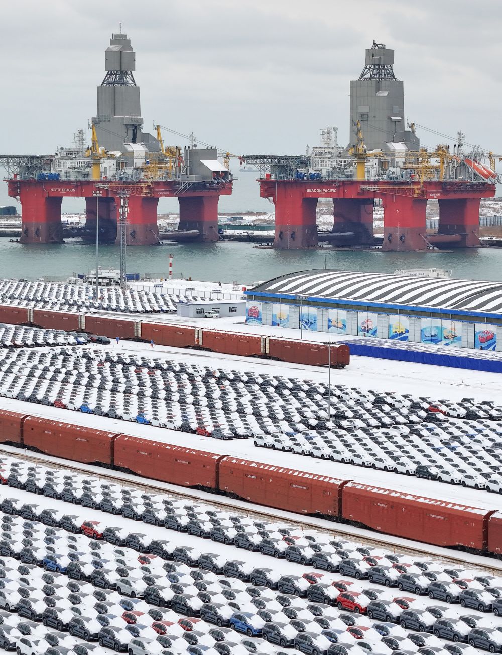 ↑ 这是1月18日在山东港口烟台港拍摄的出口汽车和半潜式钻井平台(无人机照片)。新华社发(唐克摄)