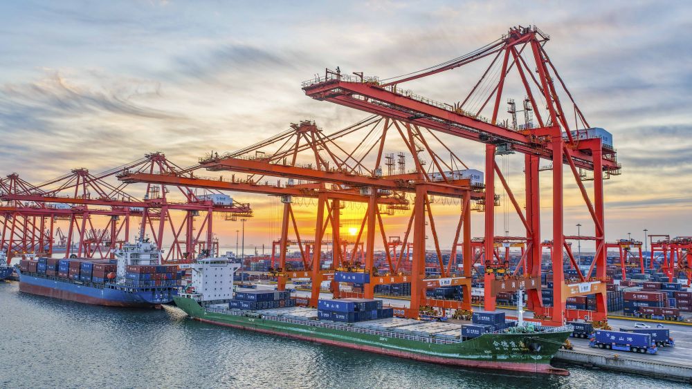 ↑ 1月19日,轮船停泊在河北省唐山港京唐港区集装箱码头进行装卸作业(无人机照片)。新华社发(刘满仓摄)