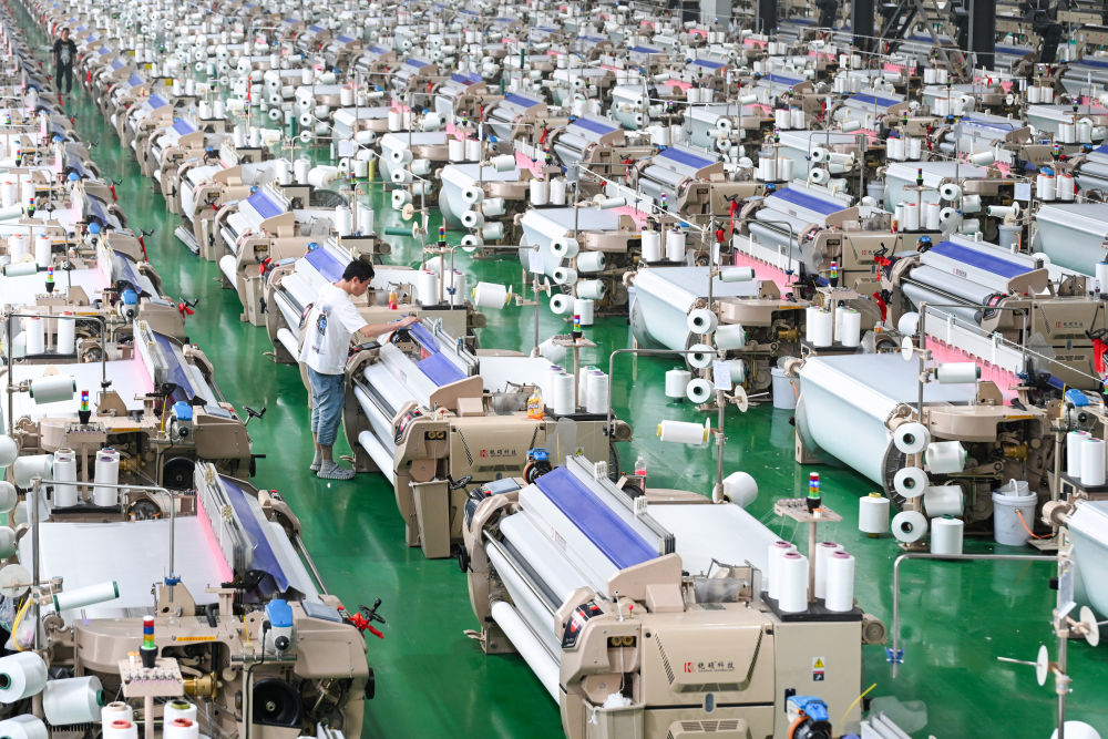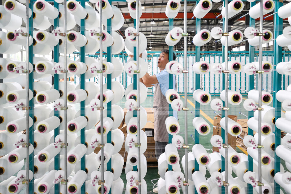 ↑ 2025年8月19日,工人在贵州省毕节高新技术产业开发区毕节宏盛纺织科技有限公司纺织车间进行生产作业。新华社发(李华摄)