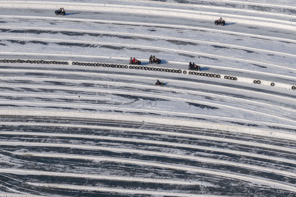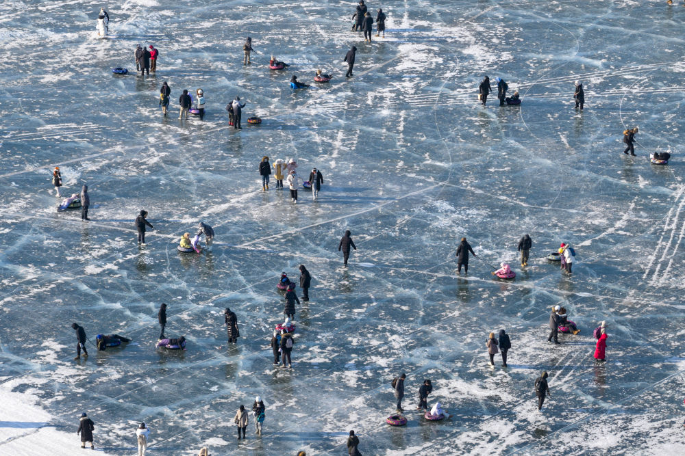 1月1日,游客在松花江哈尔滨段江面游玩(无人机照片)。新华社记者 张涛 摄