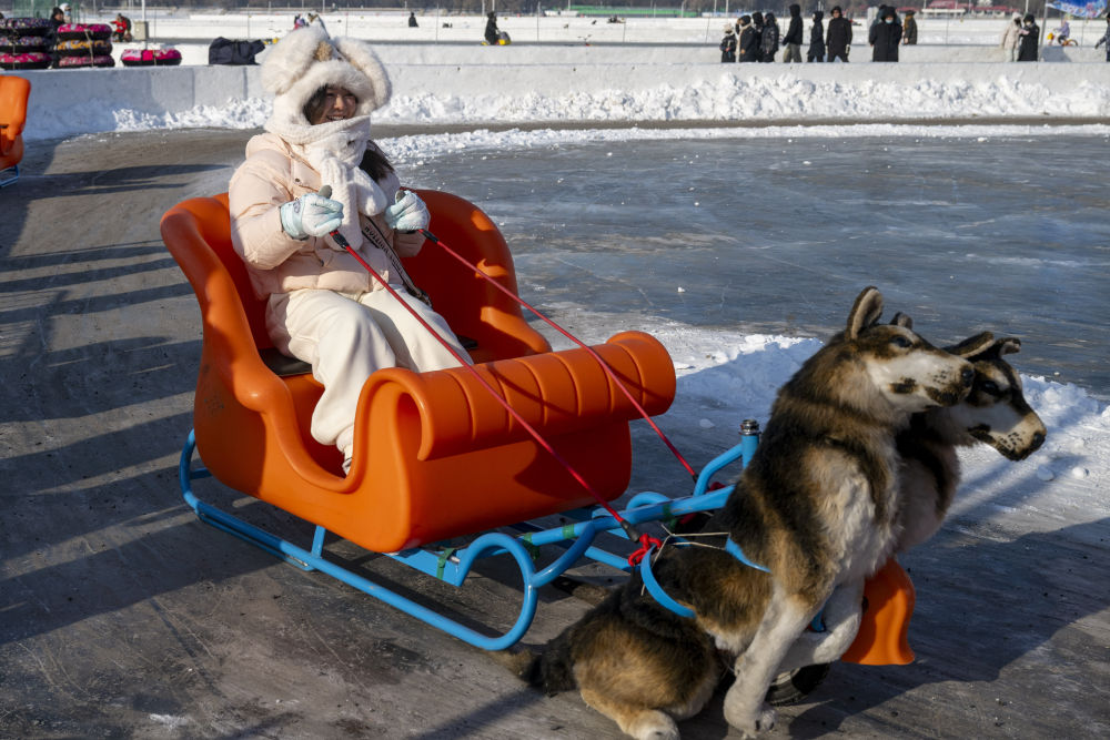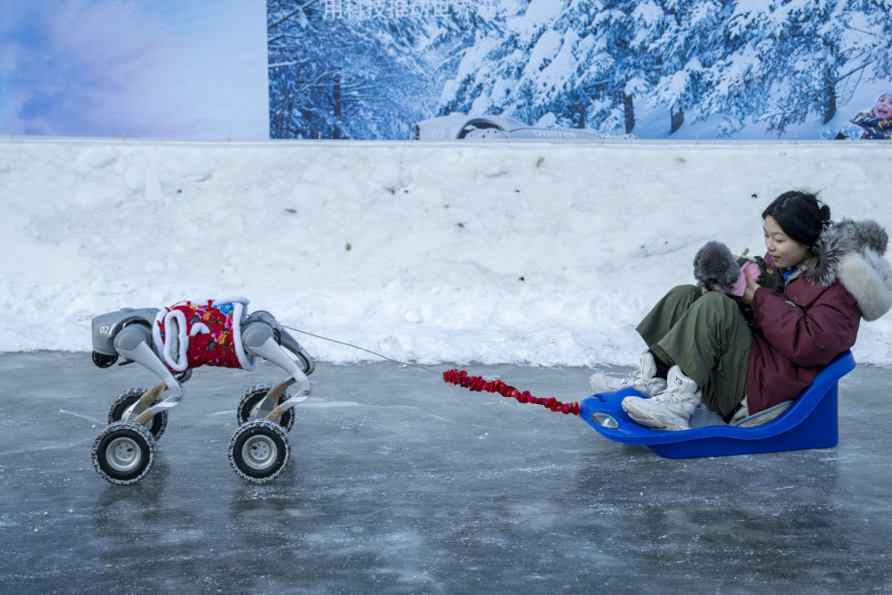 1月5日,游客在哈尔滨冰雪嘉年华园区乘坐机器人拉爬犁。新华社记者 张涛 摄