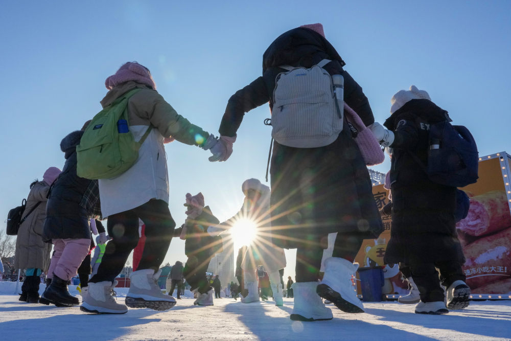 1月10日,游客在松花江哈尔滨段江面上跳舞。新华社记者 王建威 摄