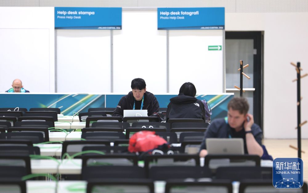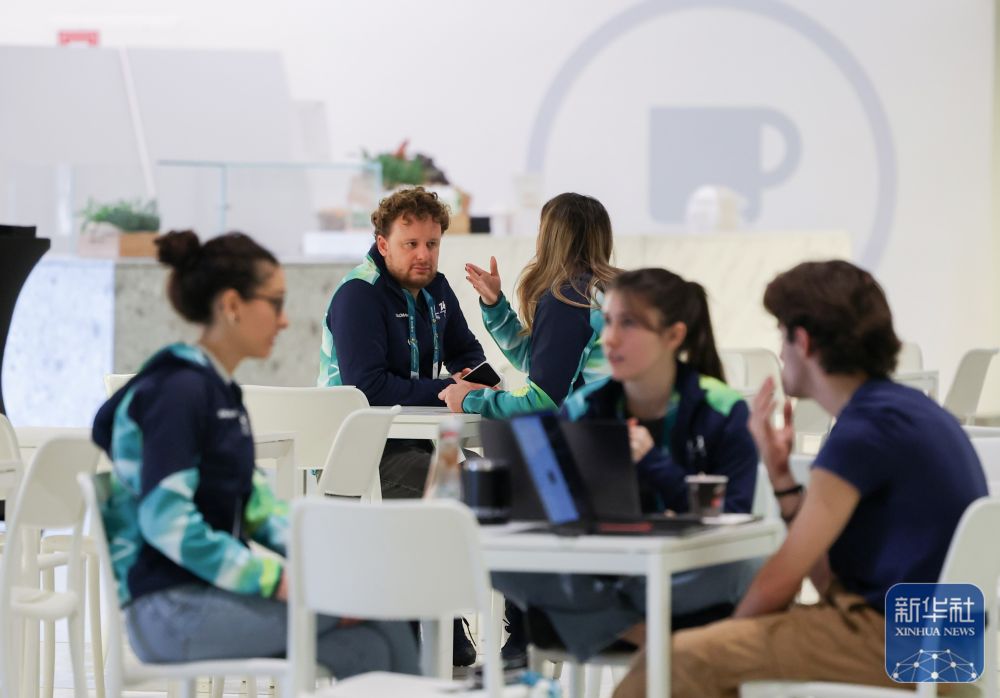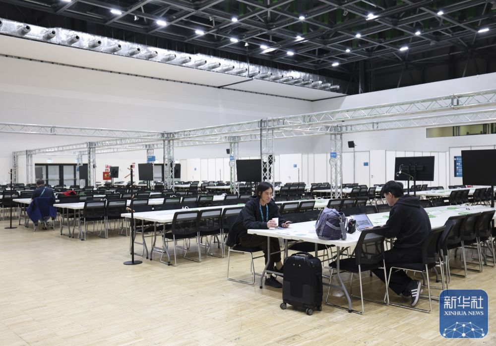 ↑ 工作人员在主媒体中心休息、交流。新华社记者 杜潇逸 摄