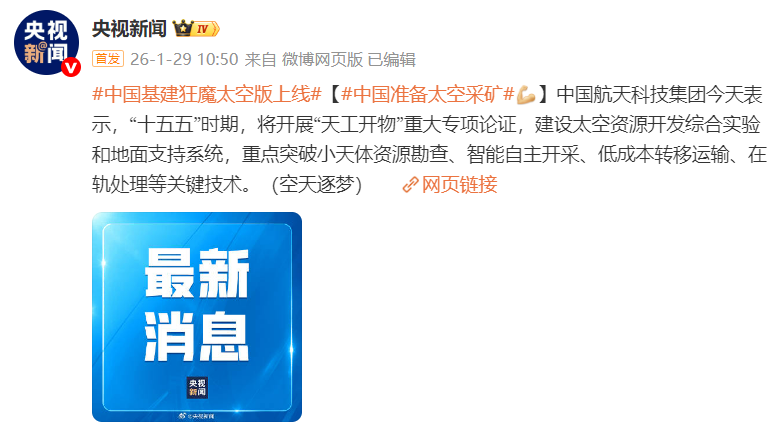 中国航天科技集团今天(29日)表示,“十五五”时期,将谋划推动太空旅游、太空数智基础设施、太空资源开发、太空交通管理等新领域发展。