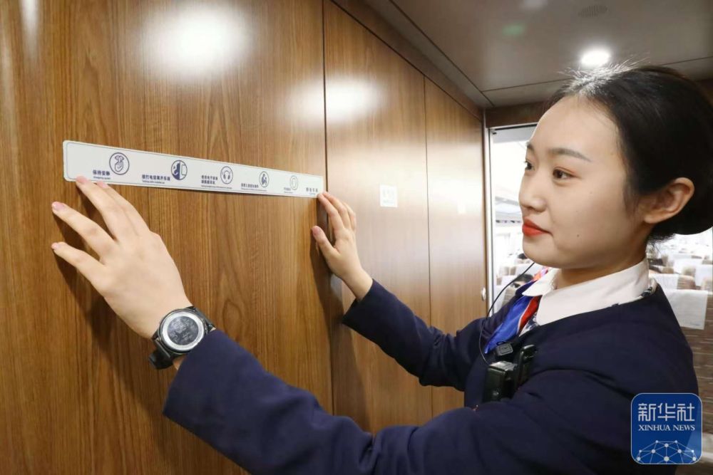 ↑ 1月27日,G6686次列车工作人员在“静音车厢”内检查标识。