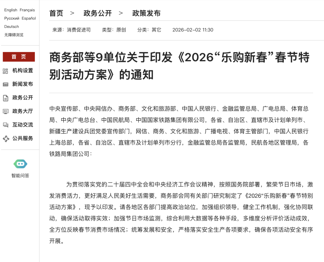 据商务部网站2月2日消息,商务部、中央宣传部、文化和旅游部、中国人民银行、金融监管总局、广电总局、体育总局、中国民航局、中国国家铁路集团有限公司等9部门研究制定了《2026“乐购新春”春节特别活动方案》(以下简称《方案》),现予以印发。