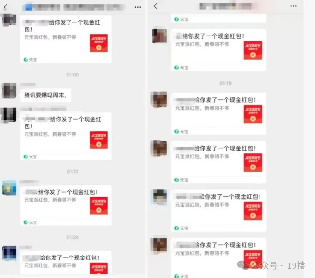 昨天,有网友表示,原本沉寂的同学群、工作群被一连串带有“元宝新春抽红包”标识的链接刷屏。不少网友称“一早起来就被腾讯元宝红包刷屏了”“元宝的红包裂变已经在微信里轮番炸群”。