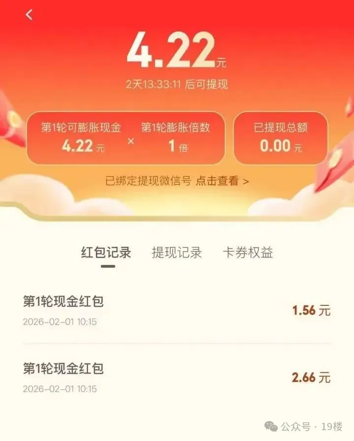 昨天上午,媒体也去抢了元宝10亿红包,一共5次抽奖机会,其中两次分别抢到了2.66元和1.56元现金红包,另外就是抽到了“马年大吉”和“万事胜意”两个马年祝福。页面显示:现金部分可以在2天之后提现。