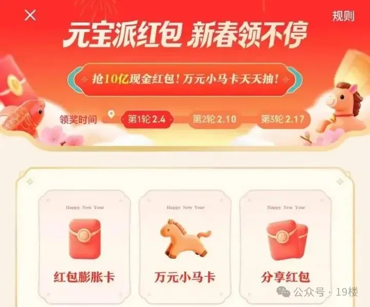参与方式也很简单,将元宝App更新到2.55.0版本以上,进入首页点击底部“抢10亿”,即可进入新春活动主会场。活动从2月1日持续到2月17日,包含“主会场抽红包”和“祝福语红包”两大核心玩法,用户最高可领万元现金红包。与社交裂变深度绑定,复刻当年微信红包的流量神话。
