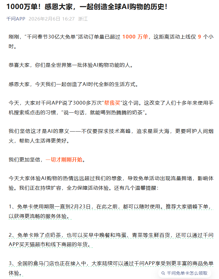 2月6日,据千问官方,“千问春节30亿大免单”活动订单量已超过1000万单,这距离活动上线仅9个小时。