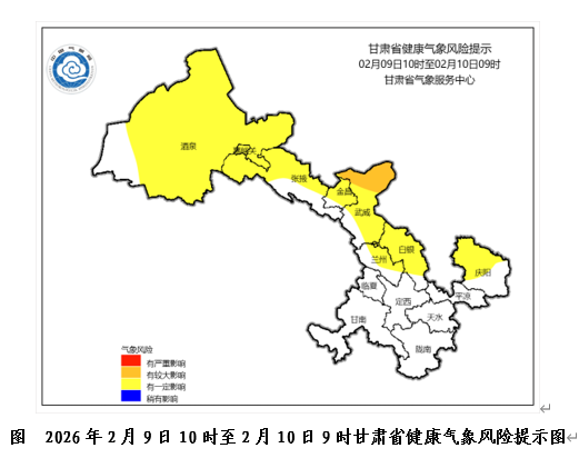 甘肃省气象服务中心、甘肃省疾控中心2026年2月9日10时发布甘肃省健康气象风险提示:受大风沙尘天气影响,预计2月9日10时至2月10日9时,武威(民勤)空气中颗粒物浓度明显增多,对人体健康有较大影响;酒泉、嘉峪关、张掖(甘州区、临泽、高台、山丹)、武威(凉州区、古浪)、金昌(金川区、永昌)、白银(白银区、平川区、靖远、景泰、会宁北部)、兰州(永登、皋兰、榆中)等市大部分地方颗粒物浓度增多,对人体健康有一定影响。空气中颗粒物浓度增多,颗粒物会同吸附于其上的细菌、病毒和有害化学成分,刺激损伤呼吸道,引起鼻干、鼻塞、流涕、流泪、咽痛、咳嗽、咳痰等刺激症状与过敏反应,引发并加重呼吸道疾病,影响人体健康。大风沙尘期间提醒公众应尽量避免或减少外出,做好关窗除尘,外出时佩戴口罩。