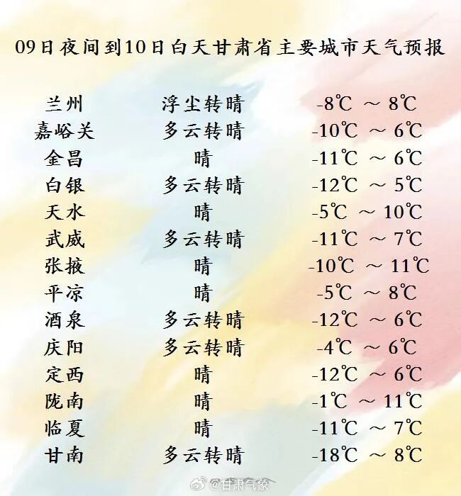 今天夜间到明天白天(2月9日20时-2月10日20时),全省各地晴或多云。另外,河西五市及白银、兰州、庆阳三市和甘南高原有5级左右西北风,阵风7-8级,局部地方有沙尘。