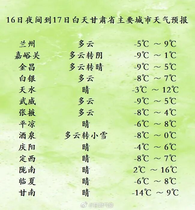 今天白天(2月16日20时-2月17日20时),河西五市多云间阴,部分地方有小雪,其中酒泉市南部有中雪;省内其余地方晴或多云,甘南州有4-5级西北风。