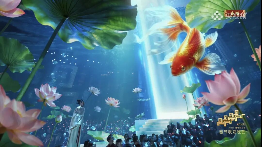 通过视觉制作在演播厅内打造更多变化的舞台效果,XR技术起到了关键作用。今年,春晚在主舞台正对面设计了一个XR舞台,12米高、5米宽的立屏也为立体影像带来更广阔的延伸空间。《丝路古韵》开场的“石窟飞天”和《智造未来》中的“宇宙畅想”,都是依托XR舞台进行延展,不仅将以往需要提前制作短片插入节目才能实现的全景特效简化为现场演绎,更为节目转场提供了更为自然的过渡方式。