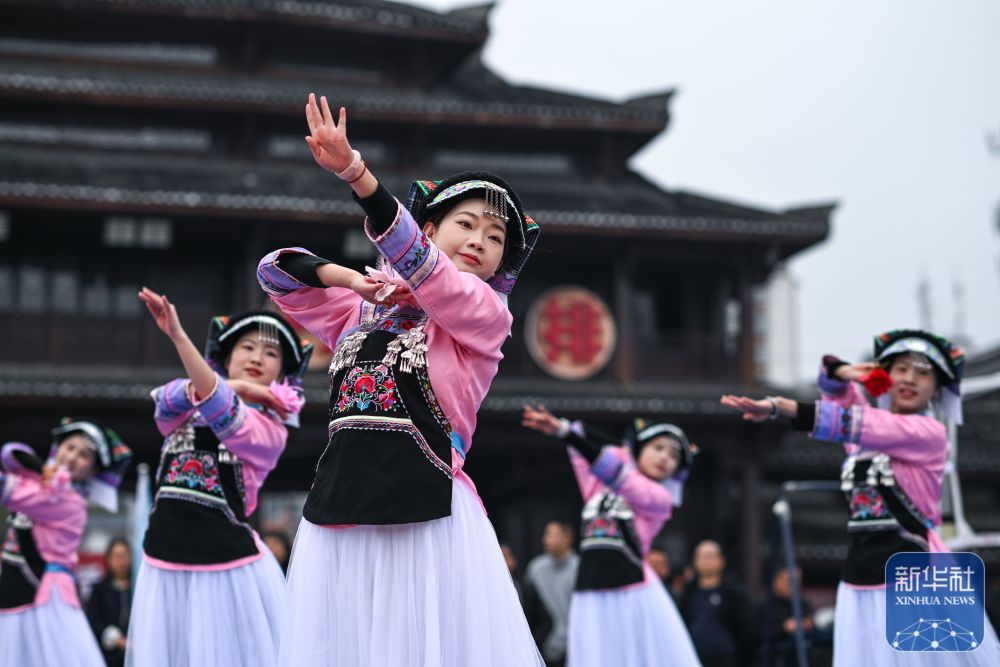 ↑ 2月21日,演员在“村排”比赛间隙表演民族舞蹈。