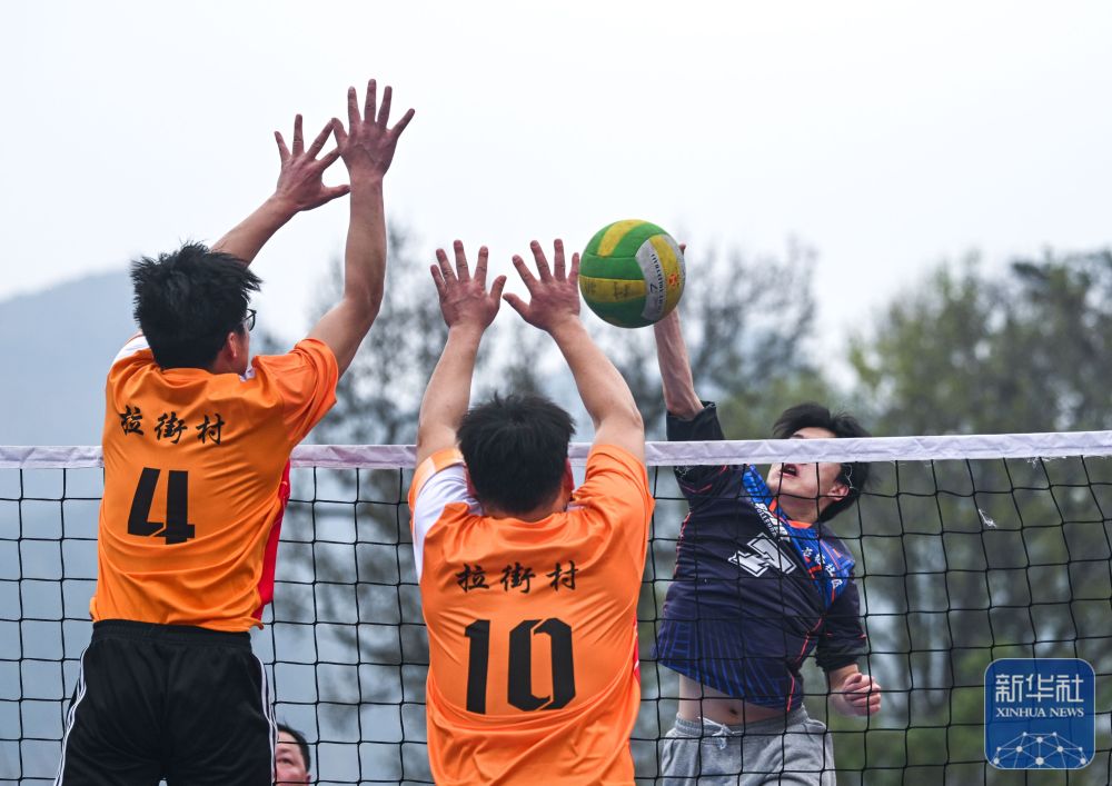 ↑ 2月21日,拉街茯苓队球员与古榕社区队球员(右)在“村排”比赛中。