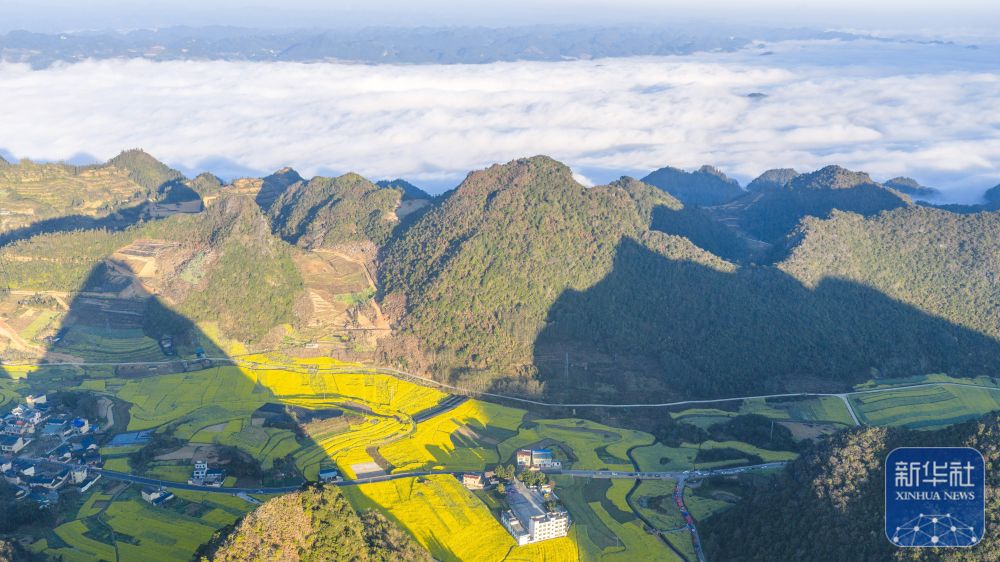 ↑ 2月22日拍摄的云南省文山壮族苗族自治州马关县夹寒箐镇上布高村油菜花海景色(无人机照片)。新华社发(熊平祥摄)