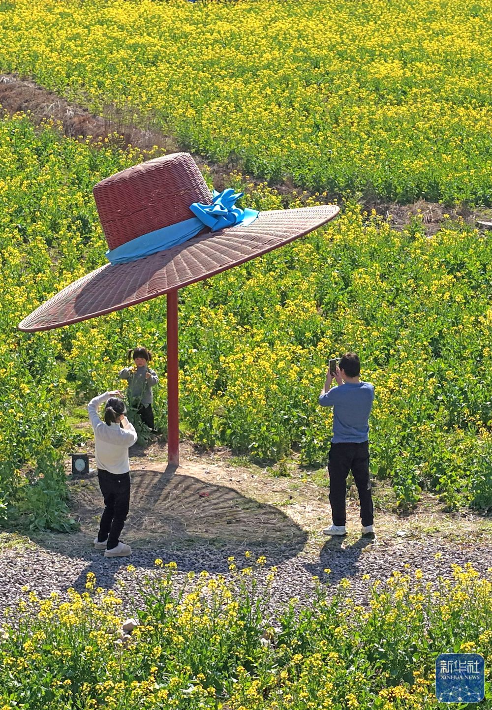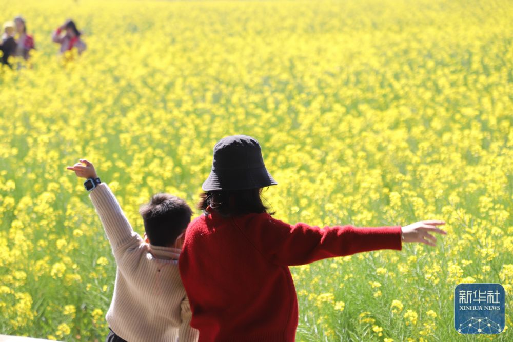 ↑ 2月21日,游人在浙江省温岭市松门镇松建村欣赏绽放的油菜花。新华社发(江文辉摄)