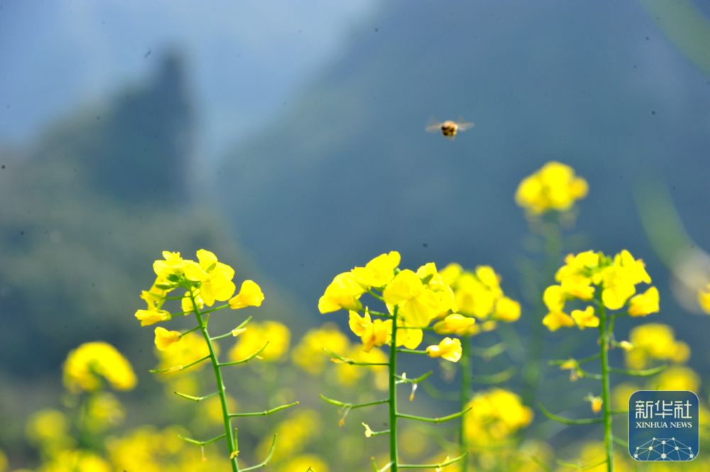 ↑ 2月20日,一只蜜蜂在广西河池市罗城仫佬族自治县四把镇新印村油菜花田间飞舞。新华社发(吴耀荣摄)