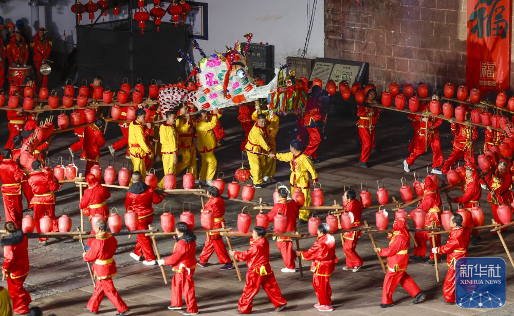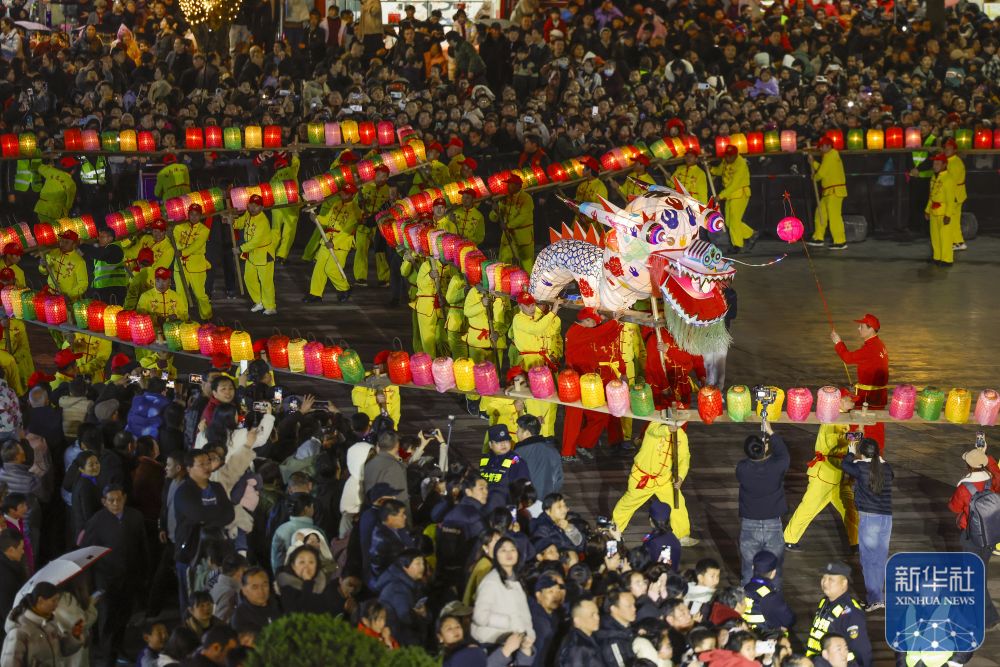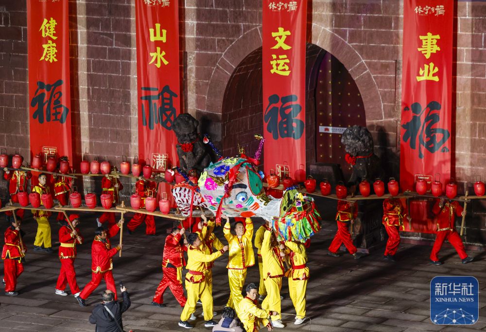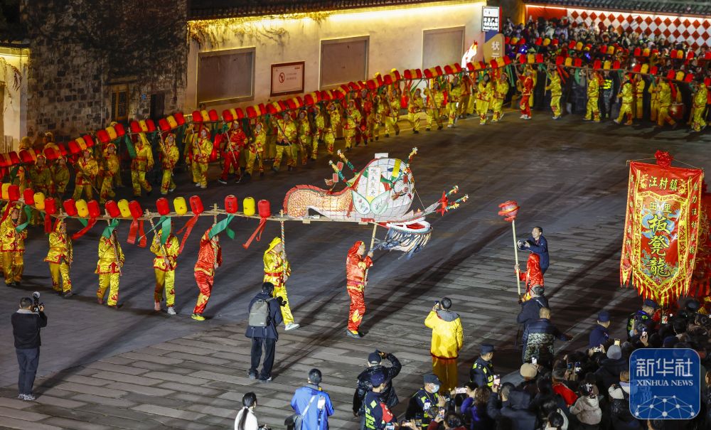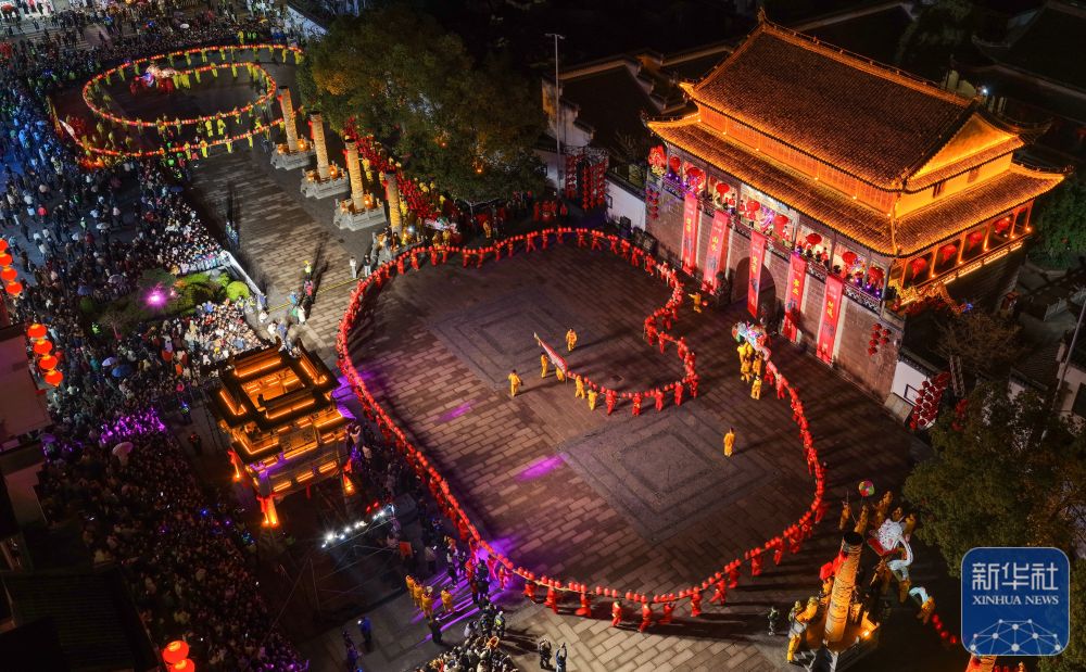 农历正月十二,安徽省黄山市休宁县“福满状元城”舞龙大会在状元广场热闹开演。百米长的非遗民俗徽州板凳龙在街巷间穿梭游动,与钟鼓楼相映成辉,喜迎元宵佳节。