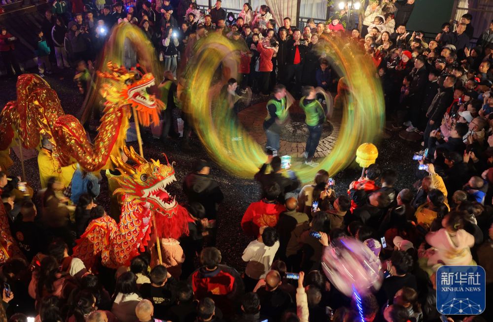 ↑ 2月28日,舞龙队在浙江省湖州市德清县乾元镇第26届浙北乾龙灯会上巡游展演。新华社发(倪立芳摄)