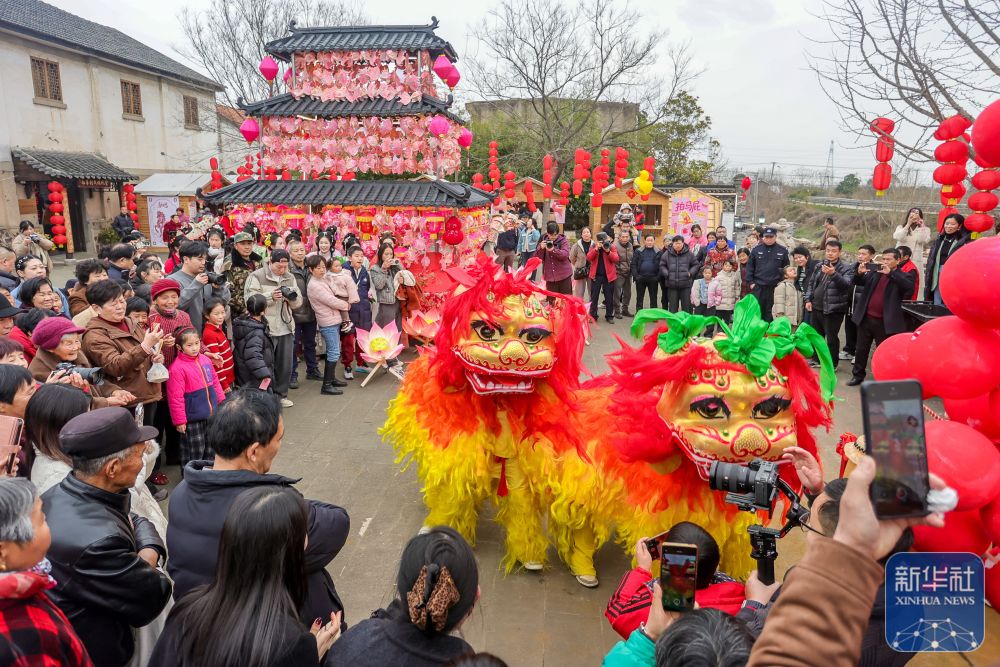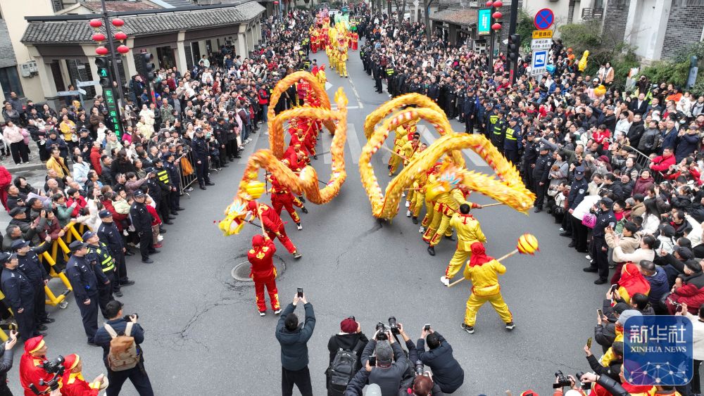↑ 2月28日,游客在浙江省湖州市长兴县画溪街道观看“踩街”表演。新华社发(吴拯摄)