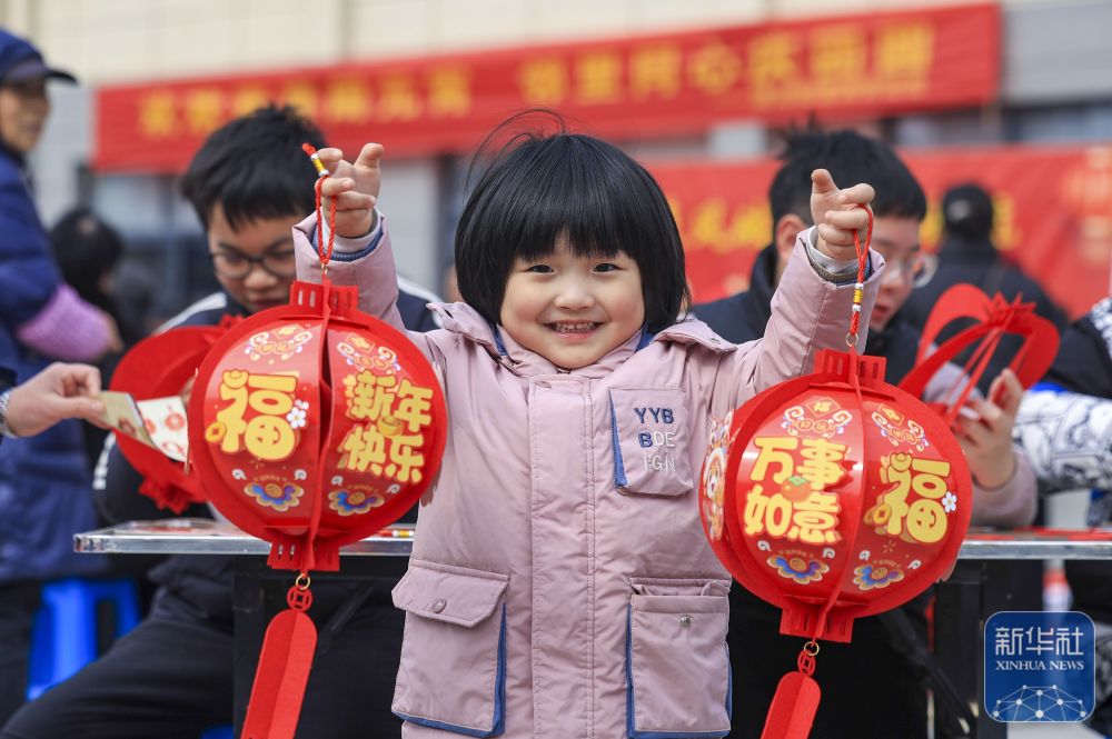 ↑ 2月28日,小朋友在江苏省泰兴市济川街道商井社区元宵节主题活动中展示灯笼。新华社发(顾继红摄)