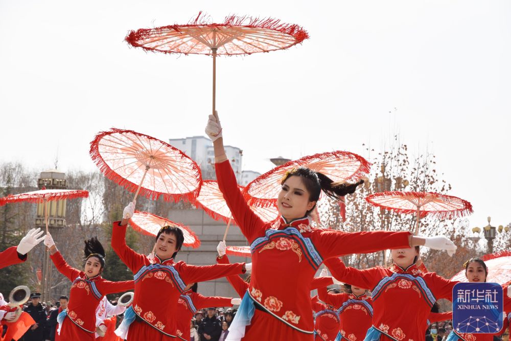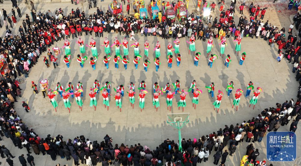 ↑ 3月1日,秧歌队员在甘肃省和政县表演秧歌(无人机照片)。新华社发(史有东摄)