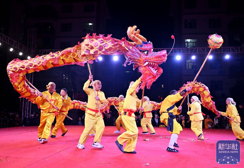 ↑ 2月27日,村民在湖北省宣恩县高罗镇歌乐城社区进行舞龙表演。新华社发(宋文摄)