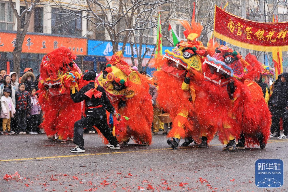 ↑ 3月1日,社火队员在甘肃省定西市安定区内官营镇先锋村冒雪表演舞狮。新华社发(陈永刚摄)