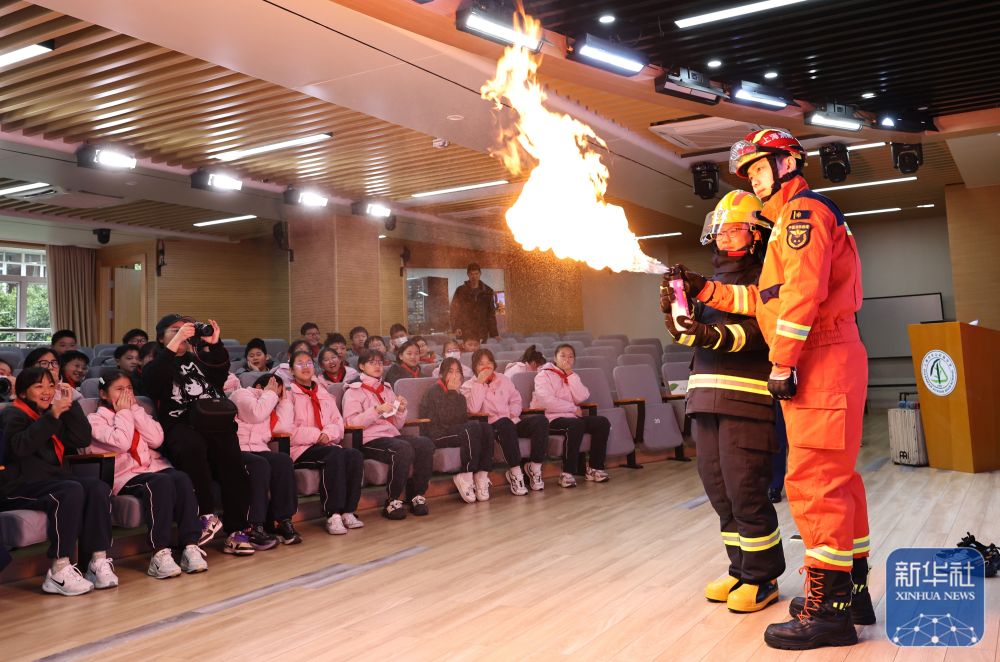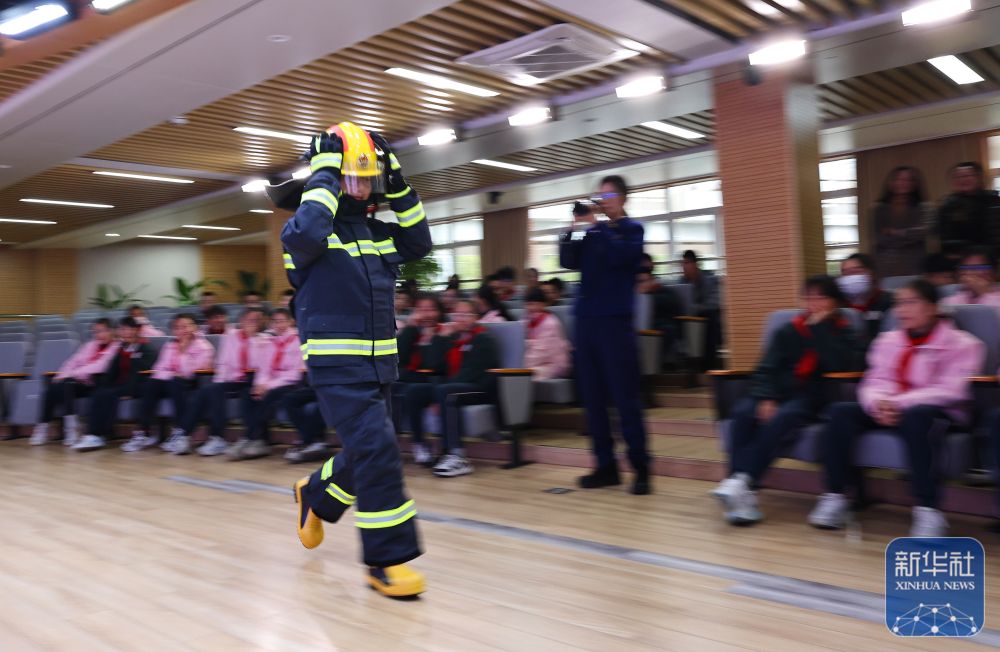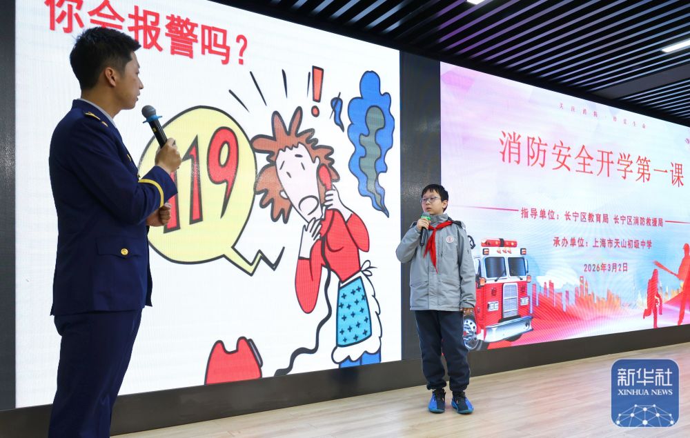 ↑ 3月2日,上海市长宁区消防救援局为上海市天山初级中学学生带来一堂消防安全实训课。这是消防员在课堂上与学生进行拨打119火警电话的情景演示。