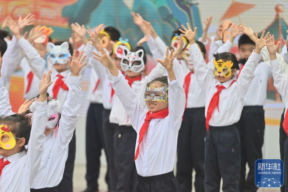 ↑ 3月2日,在广西南宁市滨湖路小学,孩子们在开学典礼上进行情景表演。